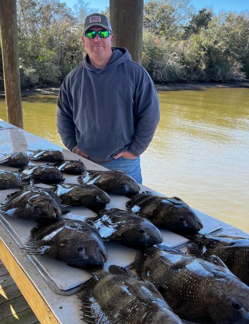 Had repeat client Toby on the boat today. We were greeted by very low water this morning, so we bounced around some deep holes. Toby caught some sheepshead for the first time and landed a bull red. Made it back to the dock before all the water was gone from my slip.
