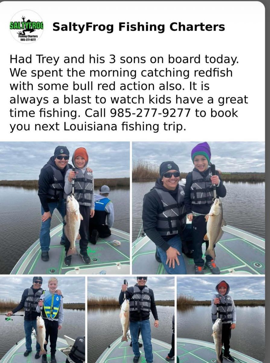 Had Trey and his 3 sons on board today. We spent the morning catching redfish with some bull red action also. It is always a blast to watch kids have a great time fishing. Call 985-277-9277 to book you next Louisiana fishing trip.